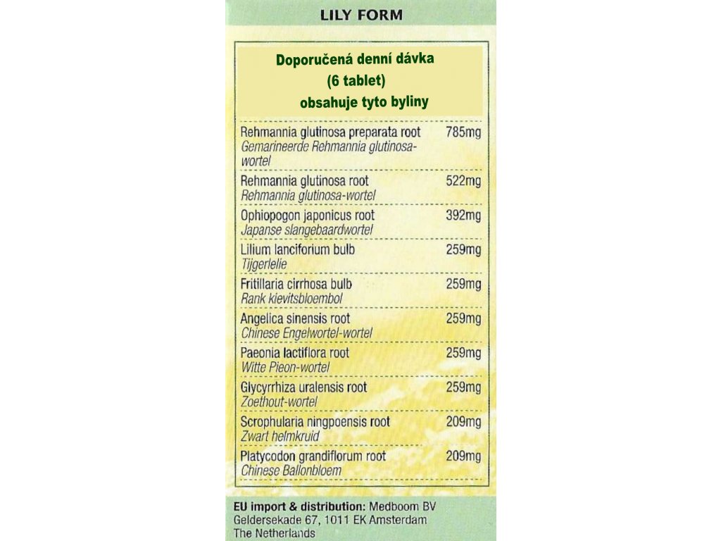 Radix Rehmanniae Preparata 23% , Radix Rehmanniae 15% , Radix Ophiopogonis 11% , Bulbus Lilii 7.5% , Radix Scrophulariae 7.5% , Bulbus Fritillariae Cirrhosae 7.5% , Radix Angelicae Sinensis 7.5% , Radix Paeoniae Albae 7.5% , Radix Glycyrrhizae 7.5% , Radix Platycodi 6%