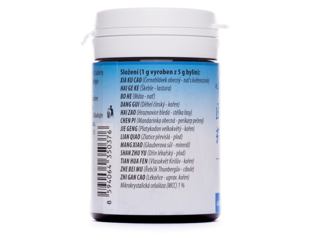 Složení (1 g vyroben z 5 g bylin): Xia ku cao (Černohlávek obecný - nať s květenstvím), Hai ge ke (Škeble - lastura), Bo he (Máta - nať), Dang gui (Děhel čínský - kořen), Hai zao (Hroznovice bledá - stélka řasy), Chen pi (Mandarinka obecná - perikarp pečený), Jie geng (Platykodon velkokvětý - kořen), Lian qiao (Zlatice převislá - plod), Mang xiao (Glauberova sůl - minerál), Shan zhu yu (Dřín lékařský - plod), Tian hua fen (Vlasokvět Kirilův - kořen), Zhe bei mu (Řebčík thunbergův - cibule), Zhi gan cao (Lékořice - uprav. kořen), Mikrokrystalická celulóza (MCC) 1 %